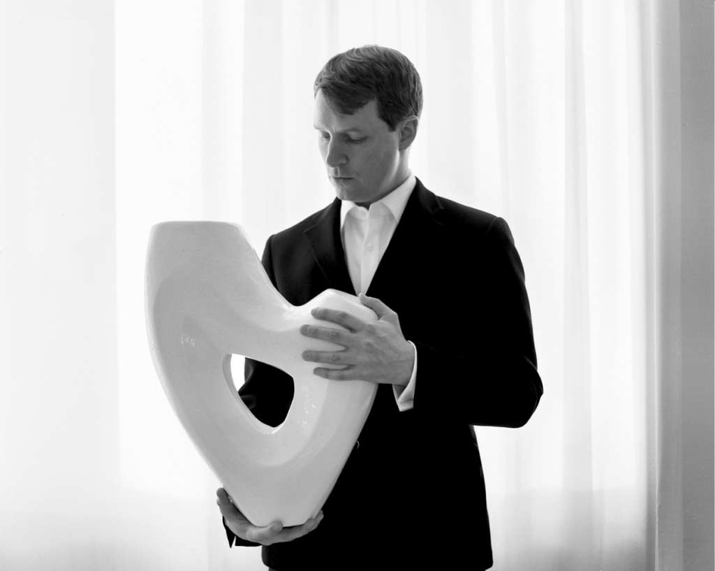 The tradition of the artist’s portrait or self-portrait, in which artists are seen posing with their work, goes back many centuries. Brancusi set the standard for modern artists in the many studio self-portraits he created in the early twentieth century. Artist portraiture seemed to follow a set of conventions established by Brancusi, with artists frequently photographed in standard poses such as “through the hole”, “artist working”, “cradling the sculpture”, or simply “intense concentration”. The Sculpture-Props seen in the photographs were created using polymer-coated polystyrene.
